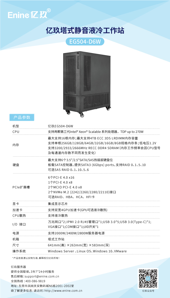 支持两颗英特尔第3代至强可扩展处理器,TDP up to 270;最大支持4张双宽GPU加速卡(GPU可选液冷散热),提供强大的运算性能。